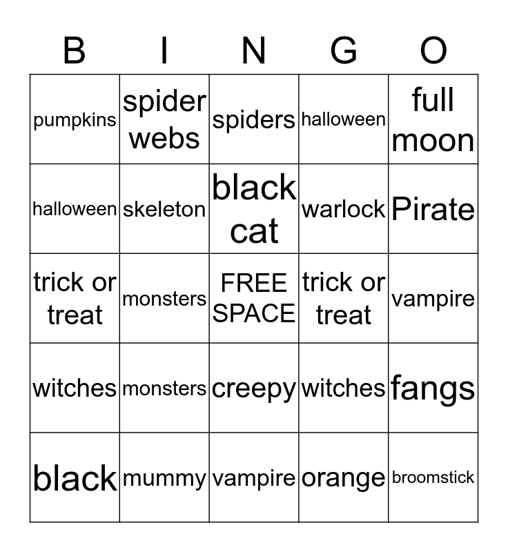 ⚠ This card has duplicate items: magic (2), orange (2), pumpkins (2), vampire (2), fangs (2), skeleton (2), BOO (2), warlock (2), spooky (2), halloween (2), black cat (2), ghost (2), spider webs (2), goblins (2), costumes (2), full moon (2), monsters (2), mummy (2), broomstick (2), trick or treat (2), haunted house (2), witches (2), spiders (2)