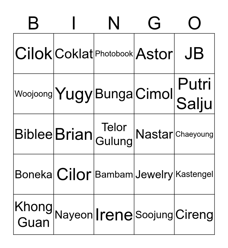 This bingo card has 25 words: Cilor, Irene, Bunga, Khong Guan, JB, Cilok, Woojoong, Coklat, Nastar, Bambam, Cimol, Biblee, Jewelry, Kastengel, Yugy, Cireng, Chaeyoung, Photobook, Putri Salju, Brian, Telor Gulung, Nayeon, Boneka, Astor and Soojung.