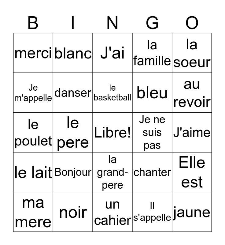 This bingo card has a free space and 24 words: Bonjour, noir, le basketball, ma mere, la soeur, merci, Je m'appelle, blanc, Je ne suis pas, la grand-pere, bleu, le poulet, chanter, Elle est, danser, Il s'appelle, J'aime, J'ai, au revoir, le pere, jaune, le lait, la famille and un cahier.
