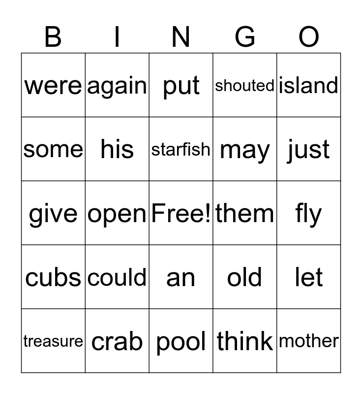 This bingo card has a free space and 24 words: could, crab, starfish, treasure, island, were, some, again, them, an, may, give, old, let, his, think, fly, put, just, open, mother, cubs, shouted and pool.