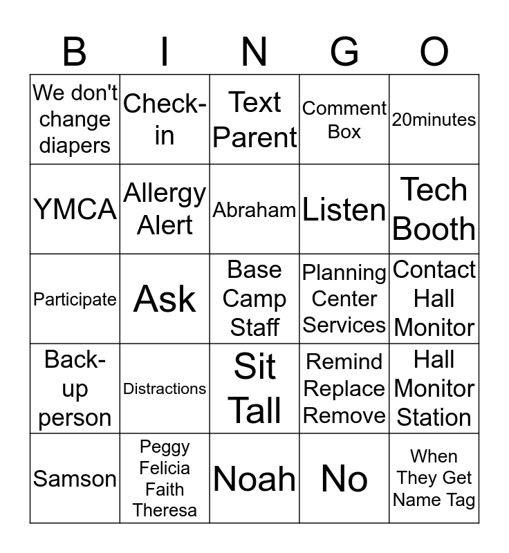 This bingo card has 25 words: Distractions, Noah, Abraham, Samson, 20minutes, We don't change diapers, YMCA, Check-in, Planning Center Services, Sit Tall, Listen, Participate, Remind Replace Remove, Hall Monitor Station, Allergy Alert, When They Get Name Tag, Contact Hall Monitor, Text Parent, Tech Booth, Ask, Base Camp Staff, Peggy Felicia Faith Theresa, Back-up person, Comment Box and No.