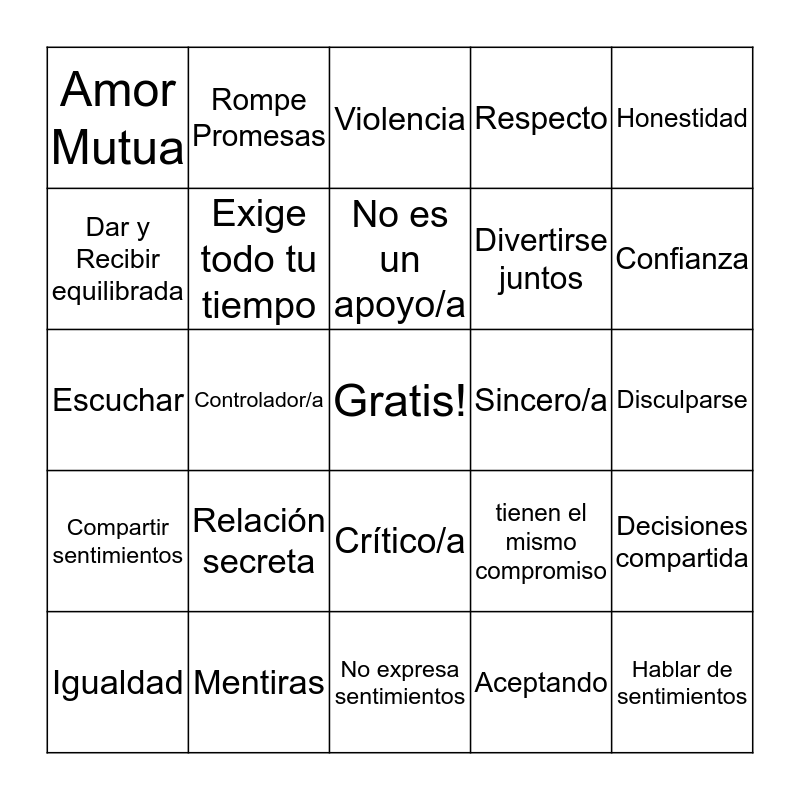 This bingo card has a free space and 34 words: Valores similares, Egocéntrico/a, Actitud defensiva, Consideración, Disculparse, Dar y Recibir equilibrada, Exige todo tu tiempo, No expresa sentimientos, Divertirse juntos, Hablar de sentimientos, Escuchar, Rompe Promesas, Aceptando, Buena Comunicación, Compartir sentimientos, Controlador/a, Crítico/a, Sincero/a, Decisiones compartida, Igualdad, Mentiras, responsabilidades desequilibradas, Respecto, Confianza, Metas propias, Relación secreta, Violencia, Buenos amigos, Honestidad, Amor Mutua, Manipulación, No es un apoyo/a, tienen el mismo compromiso and Perdonan los errores.