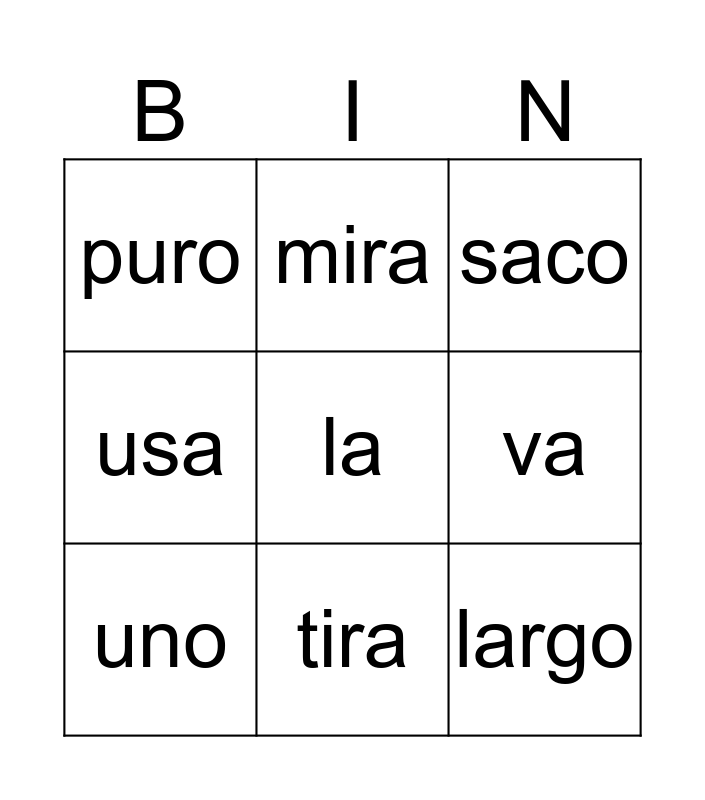 This bingo card has 17 words: mota, pino, saco, puro, gato, usa, lisa, uno, tira, va, él, ella, la, mira, largo, vamos and y.
