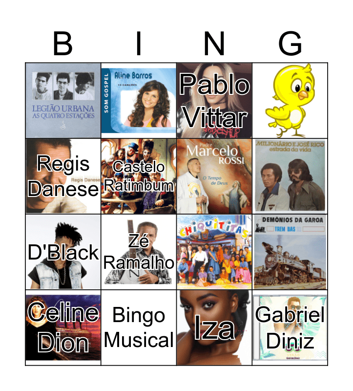 This bingo card has 23 images and 12 words: Sandy e Júnior, Xuxa, Regis Danese, Castelo Ratimbum, Bingo Musical, Mamonas Assassinas, D'Black, Iza, Pablo Vittar, Zé Ramalho, Celine Dion and Gabriel Diniz.