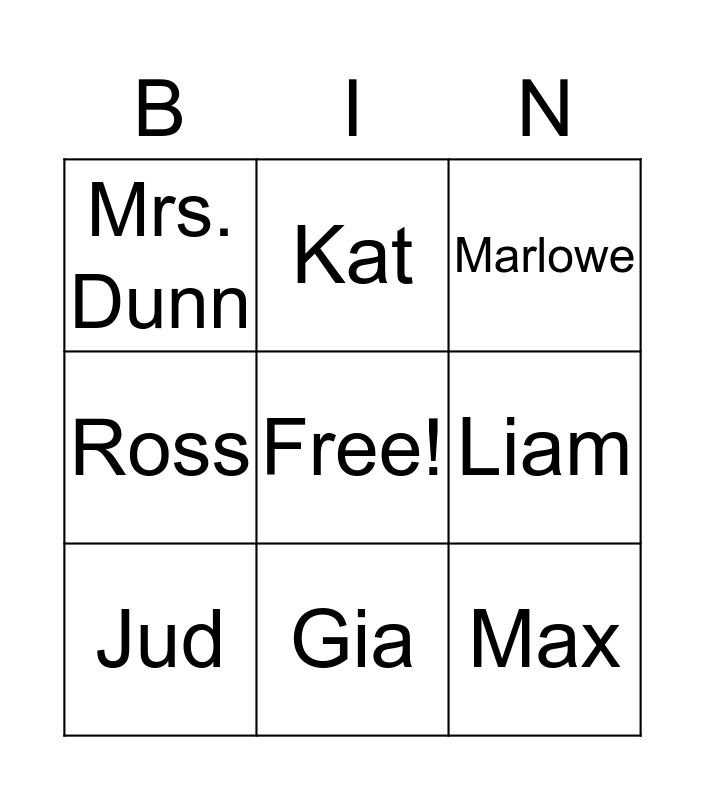 This bingo card has a free space and 8 words: Liam, Marlowe, Kat, Jud, Mrs. Dunn, Max, Ross and Gia.