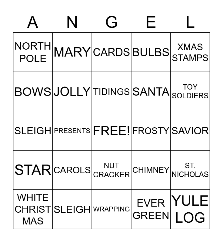 This bingo card has a free space and 24 words: CAROLS, SLEIGH, TIDINGS, WHITE CHRIST MAS, XMAS STAMPS, NORTH POLE, BOWS, MARY, FROSTY, NUT CRACKER, SANTA, SLEIGH, CHIMNEY, ST. NICHOLAS, JOLLY, EVER GREEN, SAVIOR, CARDS, TOY SOLDIERS, PRESENTS, YULE LOG, STAR, BULBS and WRAPPING.