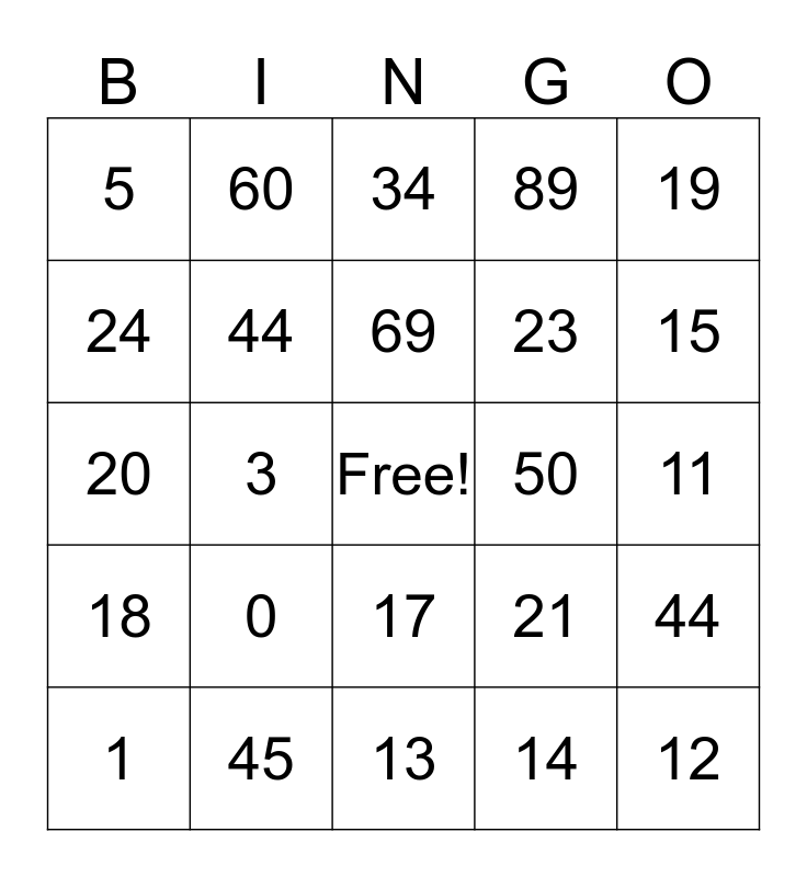This bingo card has a free space and 29 words: 1, 2, 3, 4, 5, 34, 44, 0, 50, 45, 11, 12, 13, 14, 15, 16, 17, 18, 19, 20, 21, 22, 23, 24, 89, 60, 44, 69 and 100.