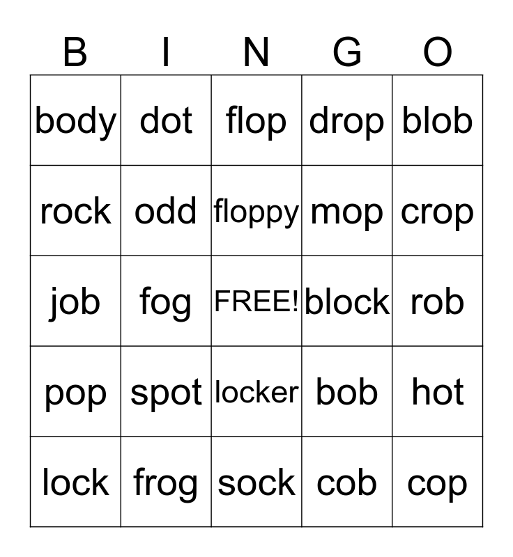 This bingo card has a free space and 24 words: spot, frog, floppy, lock, blob, body, rock, dot, block, locker, mop, job, bob, hot, odd, cob, rob, flop, crop, fog, cop, pop, drop and sock.