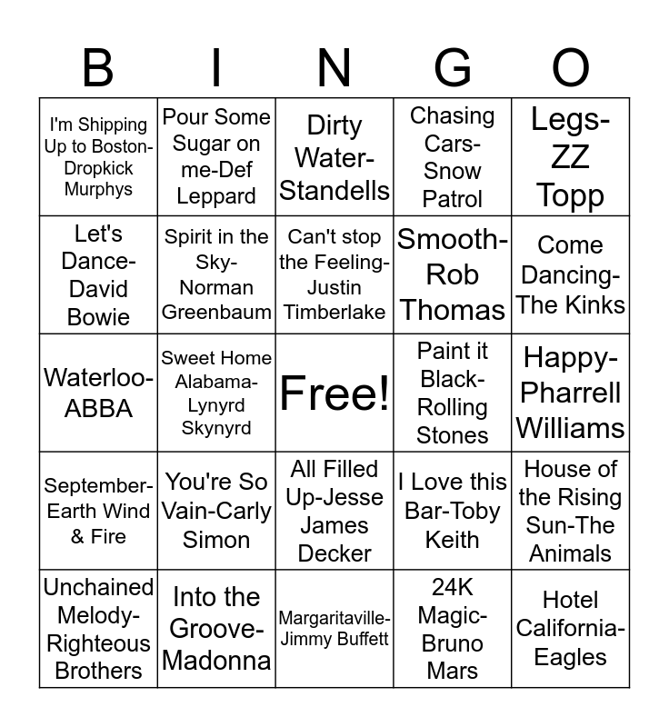 This bingo card has a free space and 31 words: Margaritaville-Jimmy Buffett, Oh Pretty Woman-Roy Orbision, Sweet Home Alabama-Lynyrd Skynyrd, Cowboy-Kid Rock, I'm Shipping Up to Boston-Dropkick Murphys, Dirty Water-Standells, Spirit in the Sky-Norman Greenbaum, I Love this Bar-Toby Keith, Paint it Black-Rolling Stones, 24K Magic-Bruno Mars, Happy-Pharrell Williams, Hotel California-Eagles, Fireball-Pitbull, Drive-Cars, Come Dancing-The Kinks, Smooth Operator-Sade, House of the Rising Sun-The Animals, You're So Vain-Carly Simon, September-Earth Wind & Fire, All Filled Up-Jesse James Decker, Legs-ZZ Topp, Summer Nights-Grease, Unchained Melody-Righteous Brothers, Pour Some Sugar on me-Def Leppard, Smooth-Rob Thomas, Let's Dance-David Bowie, Chasing Cars-Snow Patrol, Waterloo-ABBA, Into the Groove-Madonna, Can't stop the Feeling-Justin Timberlake and Up on a Roof-James Taylor.