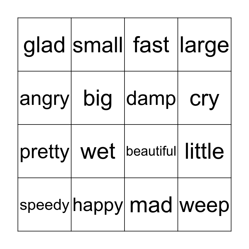 This bingo card has 16 words: happy, little, fast, glad, pretty, small, beautiful, mad, angry, big, speedy, large, wet, cry, damp and weep.