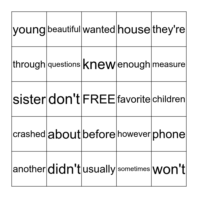 This bingo card has a free space and 24 words: about, didn't, knew, another, they're, young, through, beautiful, favorite, before, enough, sister, however, phone, questions, sometimes, children, wanted, measure, don't, won't, crashed, house and usually.
