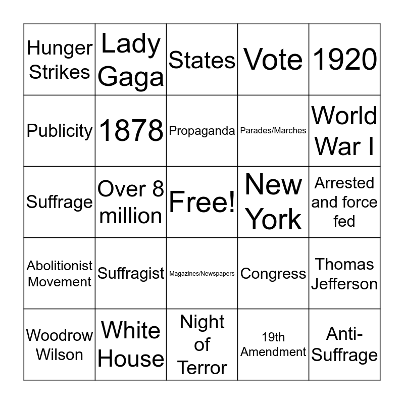 This bingo card has a free space and 34 words: Women, 19th Amendment, 1848, White, Abolitionist Movement, 1878, 1920, Woodrow Wilson, Lady Gaga, Protest, Propaganda, States, Elected to office, Seneca Falls Convention, New York, World War I, White House, Suffrage, Suffragist, Congress, Magazines/Newspapers, Feminism, Hunger Strikes, Arrested and force fed, Night of Terror, Anti-Suffrage, Vote, Equality, Parades/Marches, Publicity, Beneath Men, Over 8 million, Thomas Jefferson and Frederick Douglass.