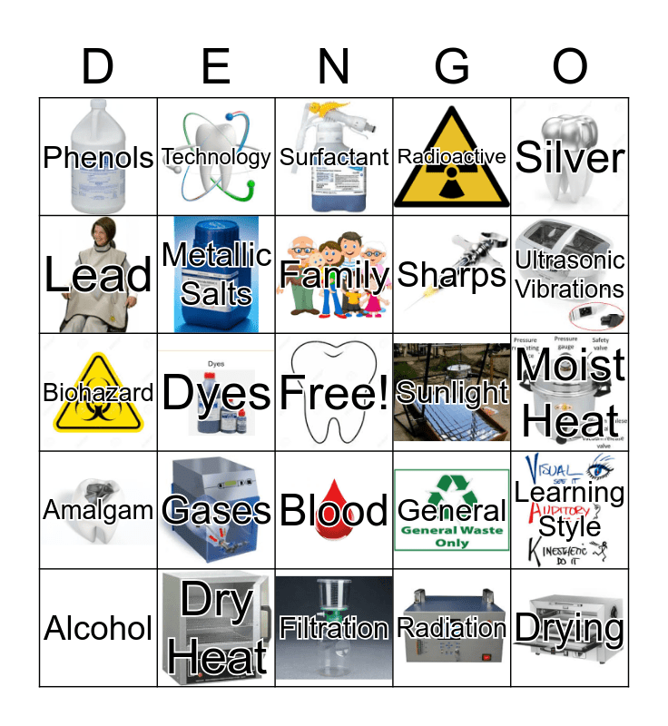 This bingo card has 28 images, a free space and 29 words: Alcohol, Aldehydes, Dyes, Halogens, Phenols, Surfactant, Metallic Salts, Gases, Sunlight, Dry Heat, Moist Heat, Drying, Filtration, Radiation, Ultrasonic Vibrations, Mercury, Blood, Amalgam, Silver, Biohazard, General, Hazardous, Sharps, Lead, Radioactive, Technology, Learning Style, Family and Limits/ Interests.