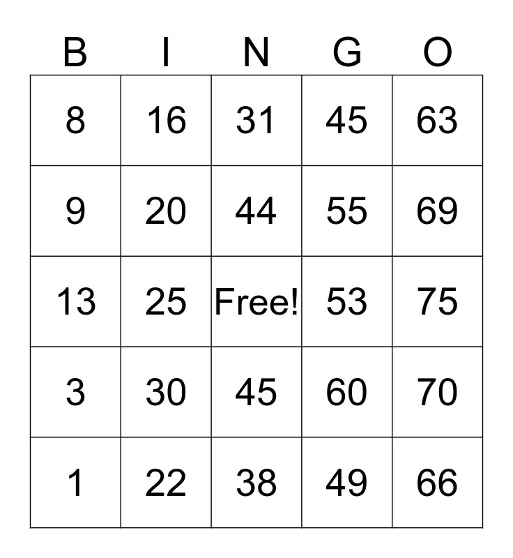 This bingo card has a free space and 24 words: 1, 30, 44, 49, 63, 8, 16, 31, 53, 75, 13, 20, 60, 70, 9, 22, 38, 45, 69, 3, 25, 45, 55 and 66.