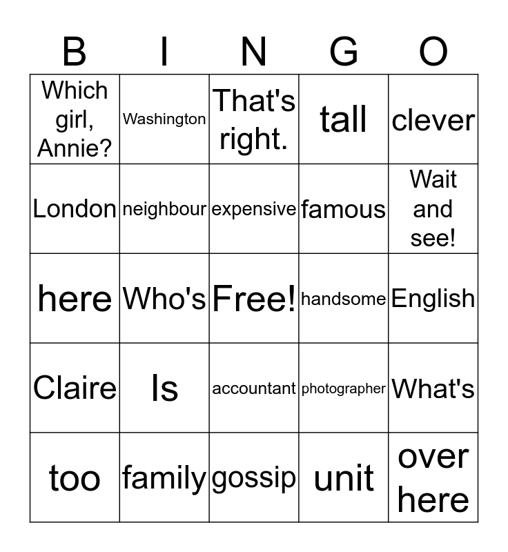 This bingo card has a free space and 34 words: lesson, unit, Annie, Polly, Claire, neighbour, clever, too, Washington, American, expensive, That's right., beautiful, husband, handsome, Wait and see!, family, here, Is, photographer, accountant, Jenkins family, Which girl, Annie?, English, gossip, over here, tall, Where?, famous, London, nationality, Who's, What's and art student.