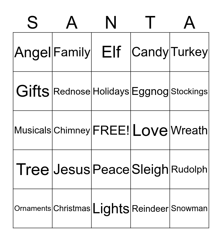 This bingo card has a free space and 24 words: Jesus, Christmas, Holidays, Ornaments, Turkey, Angel, Gifts, Family, Love, Peace, Eggnog, Musicals, Sleigh, Rudolph, Rednose, Reindeer, Wreath, Elf, Stockings, Chimney, Snowman, Tree, Candy and Lights.