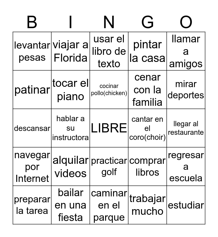 This bingo card has a free space and 24 words: alquilar videos, bailar en una fiesta, cocinar pollo(chicken), preparar la tarea, llamar a amigos, levantar pesas, patinar, viajar a Florida, cantar en el coro(choir), practicar golf, cenar con la familia, descansar, comprar libros, regresar a escuela, tocar el piano, trabajar mucho, llegar al restaurante, usar el libro de texto, mirar deportes, hablar a su instructora, estudiar, navegar por Internet, pintar la casa and caminar en el parque.
