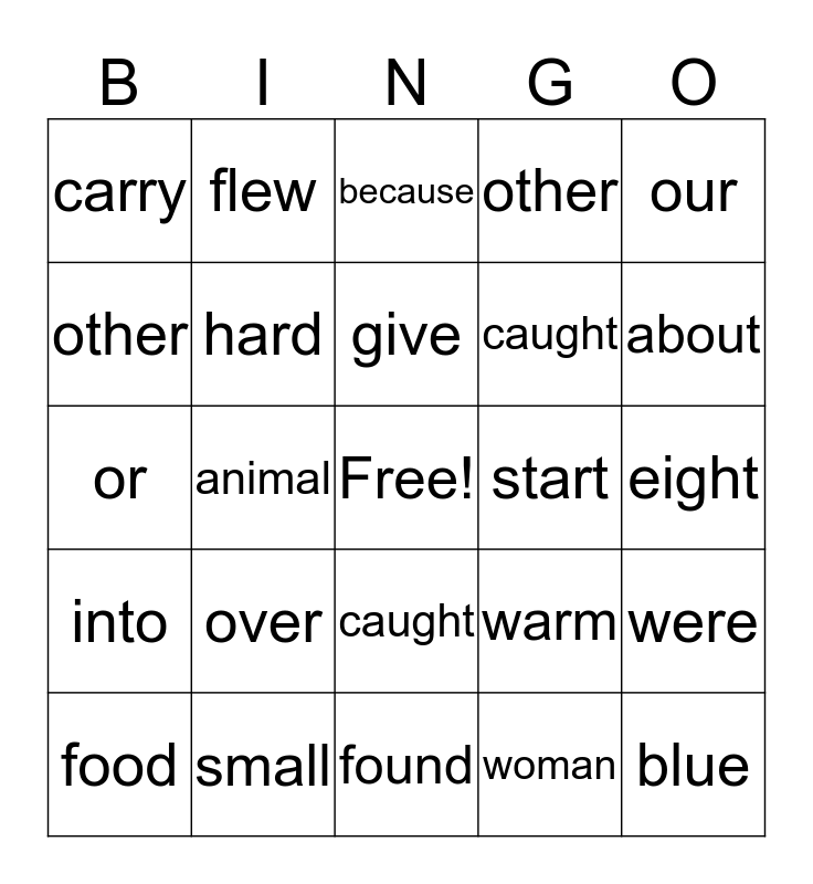 This bingo card has a free space and 24 words: over, small, give, food, our, carry, other, flew, start, caught, caught, or, warm, were, hard, woman, eight, because, about, animal, blue, into, other and found.
