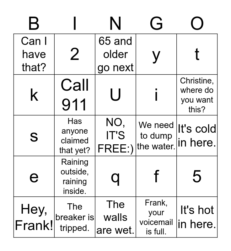 This bingo card has a free space and 29 words: Hey, Frank!, Where did this come from?, Has anyone claimed that yet?, We need more to go plates!, Can I have that?, 65 and older go next, Call 911, Raining outside, raining inside., We need to dump the water., The breaker is tripped., It's cold in here., It's hot in here., The walls are wet., Frank, your voicemail is full., Christine, where do you want this?, Go get Brandon (or Chris)., q, e, t, s, f, h, i, k, y, 2, 5, U and (.