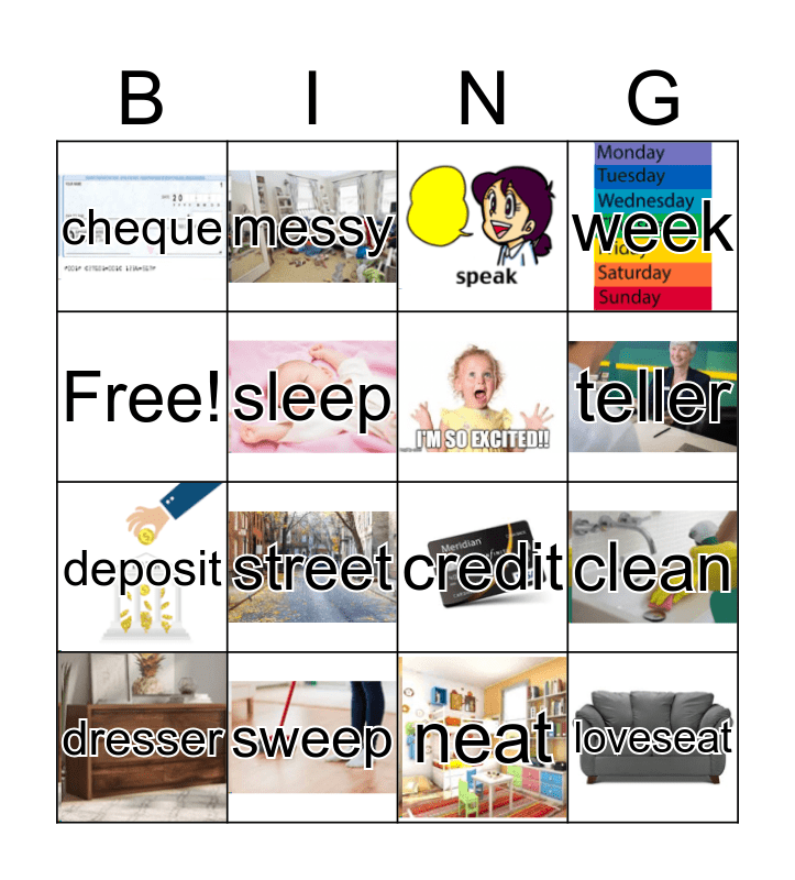 This bingo card has 15 images and 14 words: sweep, clean, cheque, deposit, messy, credit, neat, Free!, sleep, dresser, week, street, teller and loveseat.