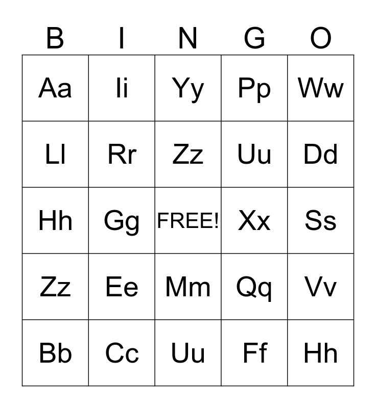 This bingo card has a free space and 24 words: Ee, Cc, Zz, Bb, Ww, Aa, Ll, Ii, Xx, Mm, Uu, Hh, Qq, Vv, Rr, Ff, Ss, Yy, Dd, Gg, Hh, Zz, Pp and Uu.