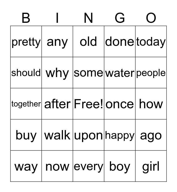 This bingo card has a free space and 24 words: walk, now, some, way, today, pretty, should, any, once, upon, water, together, happy, ago, why, boy, how, old, people, after, girl, buy, done and every.