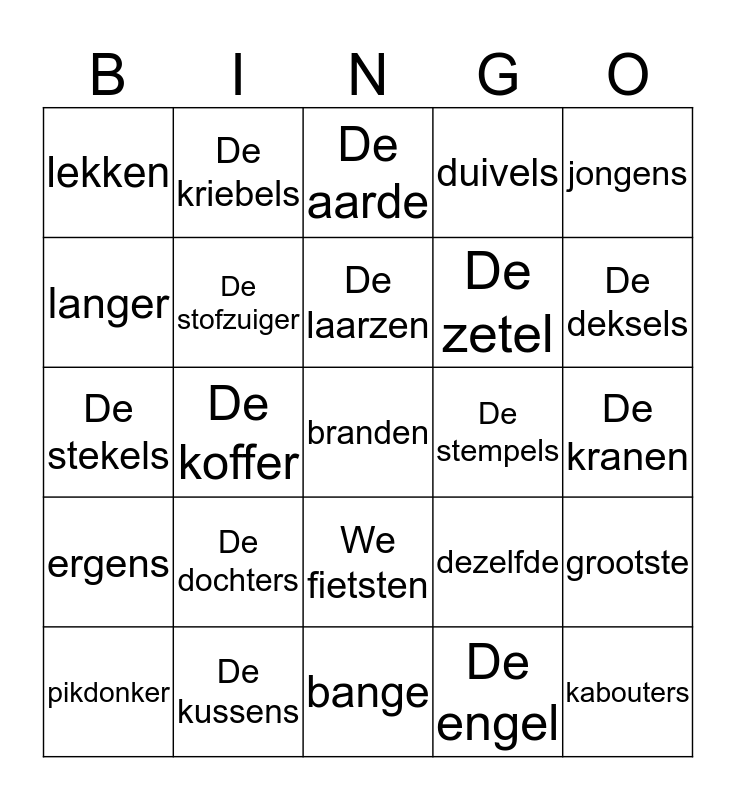 This bingo card has a free space and 34 words: de egel, De engel, slingers, De bandieten, ergens, De stofzuiger, jongens, pikdonker, De kriebels, Ik piekerde, De laarzen, De aarde, De meubels, nergens, De stempels, De deksels, De kussens, De stekels, De dochters, dezelfde, We fietsten, eerder, lekken, De kranen, bange, kabouters, duivels, De meesters, De zetel, langer, We wandelden, De koffer, grootste and kleinste.