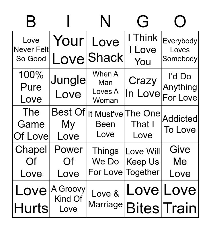 This bingo card has 75 words: Radar Love, Freeway Of Love, Love Shack, Crazy Little Thing Called Love, Love Me Do, Why Do Fools Fall In Love, Love Somebody M, What Is Love, You Can't Hurry Love, Cradle Of Love, Love Train, Say Hey (I Love You), When A Man Loves A Woman, 100% Pure Love, Can't Get Enough Of Your Love, Best Of My Love, Love Machine, It Must've Been Love, If You Had My Love, Everybody Loves Somebody, 50 Ways To Leave Your Lover, The Game Of Love, Jungle Love, Your Love, I Think I Love You, Love The One You're With, Feel Like Making Love, Is This Love, Bleeding Love, I Believe In Love, As Long As I Love You, One Love, Love Boat, Love Will Keep Us Together, I'd Do Anything For Love, Crazy In Love, For Your Love, Summer Love, Addicted To Love, Love Bites, Stop In The Name Of Love, Fooled Around & Fell In Love, Silly Love Songs, Back In Love, I Wanna Be Your Lover, Love Is Strange, Love Hurts, Love Never Felt So Good, Teenager In Love, Do You Love Me, Somebody To Love, Things We Do For Love, Love And Affection, Come And Get Your Love, Love In An Elevator, Baby I Love Your Way, Love Of A Lifetime, Hello I Love You, You Give Love A Bad Name, We Found Love, Power Of Love, Can't Help Falling In Love, Don't Pull Your Love, Love Me Like You Do, Love Without End Amen, The One That I Love, Show Me Love, Tainted Love, I Think I'm In Love, Give Me Love, Chapel Of Love, A Groovy Kind Of Love, Love Is Alright Tonight, Love & Marriage and L.O.V.E..
