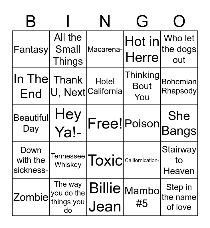 This bingo card has a free space and 29 words: Zombie, Escapade, Hey Ya!-, Self Esteem, Fantasy, Macarena-, Thank U, Next, Tennessee Whiskey, Poison, The way you do the things you do, She Bangs, Step in the name of love, Billie Jean, Mambo #5, Bohemian Rhapsody, Hello, Toxic, Down with the sickness-, Who let the dogs out, Beautiful Day, Californication-, Good Vibrations, Thinking Bout You, In The End, Hot in Herre, All the Small Things, Stairway to Heaven, Hotel California and Purple Rain.