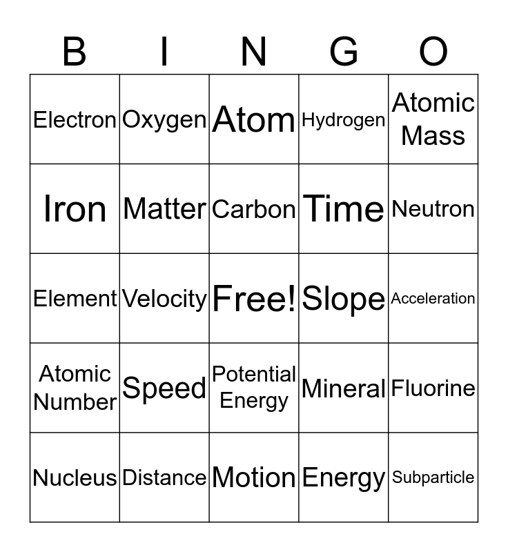 This bingo card has a free space and 29 words: Nucleus, Electron, Velocity, Proton, Electron, Atom, Matter, Speed, Slope, Distance, Acceleration, Subparticle, Motion, Energy, Neutron, Kinetic Energy, Potential Energy, Atomic Number, Atomic Mass, Element, Mineral, Periodic Table, Time, Iron, Hydrogen, Oxygen, Fluorine, Carbon and Neon.