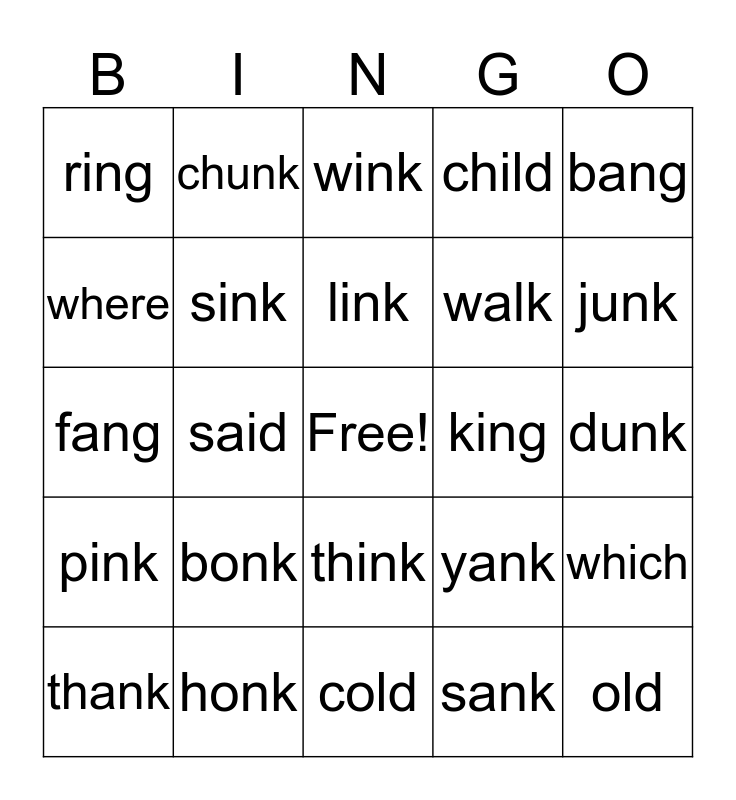 This bingo card has a free space and 34 words: hung, sank, bank, lung, pink, sink, bang, thank, chunk, sung, link, wink, wing, rang, king, junk, honk, fang, bonk, yank, think, thing, ring, dunk, cold, old, child, wild, walk, where, here, said, which and was.