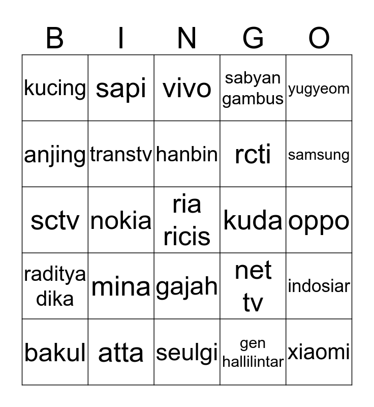 This bingo card has 25 words: mina, seulgi, hanbin, bakul, yugyeom, kucing, anjing, sapi, kuda, gajah, rcti, sctv, net tv, indosiar, transtv, xiaomi, oppo, vivo, samsung, nokia, ria ricis, atta, raditya dika, sabyan gambus and gen hallilintar.