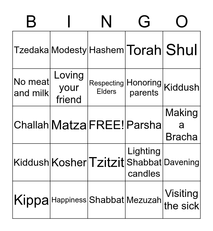 This bingo card has a free space and 24 words: Kosher, Happiness, Respecting Elders, Kippa, Shul, Tzedaka, No meat and milk, Modesty, Parsha, Tzitzit, Honoring parents, Challah, Lighting Shabbat candles, Davening, Loving your friend, Mezuzah, Making a Bracha, Hashem, Kiddush, Matza, Visiting the sick, Kiddush, Torah and Shabbat.