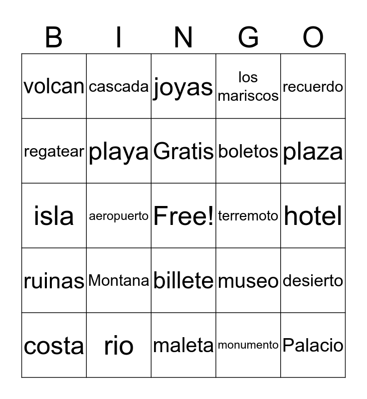 This bingo card has a free space and 24 words: Montana, rio, Gratis, costa, recuerdo, volcan, regatear, cascada, terremoto, billete, boletos, isla, museo, desierto, playa, monumento, hotel, joyas, plaza, aeropuerto, Palacio, ruinas, los mariscos and maleta.