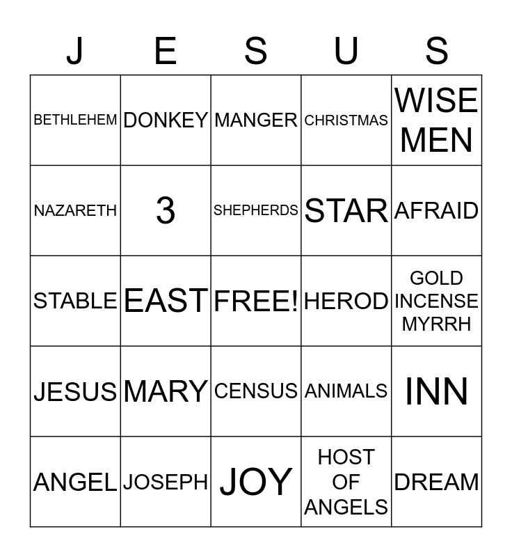 This bingo card has a free space and 24 words: MARY, JOSEPH, SHEPHERDS, ANGEL, WISE MEN, BETHLEHEM, NAZARETH, DONKEY, HEROD, CENSUS, STAR, STABLE, ANIMALS, INN, 3, HOST OF ANGELS, GOLD INCENSE MYRRH, MANGER, AFRAID, EAST, DREAM, JESUS, CHRISTMAS and JOY.