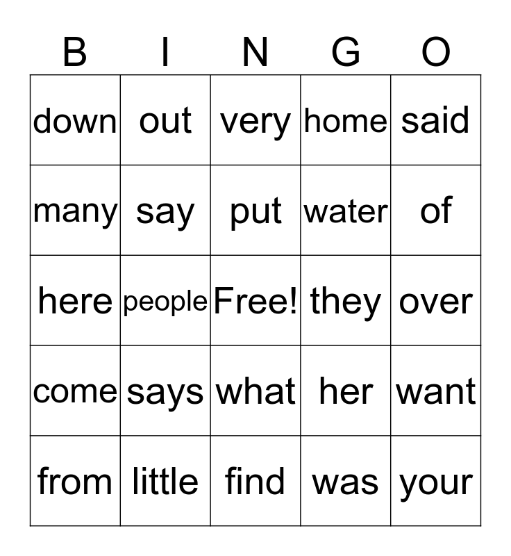This bingo card has a free space and 36 words: make, some, there, say, her, come, put, can't, said, like, people, home, again, they, of, down, under, says, your, very, over, want, little, from, find, out, here, for, water, many, saw, look, was, what, where and have.