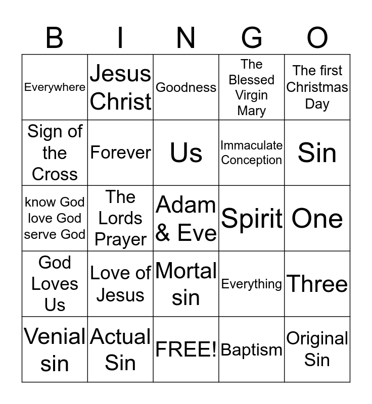 This bingo card has 31 words: FREE!, Beginning, The Lords Prayer, God, Everywhere, Goodness, Forever, Everything, Spirit, Baptism, One, Adam & Eve, Original Sin, The Catholic Church, Sin, Heaven, Three, Love of Jesus, God Loves Us, Mortal sin, The first Christmas Day, Bethlehem, Venial sin, Jesus Christ, Immaculate Conception, Sign of the Cross, The Blessed Virgin Mary, know God love God serve God, Actual Sin, Us and The Blessed Trinity.