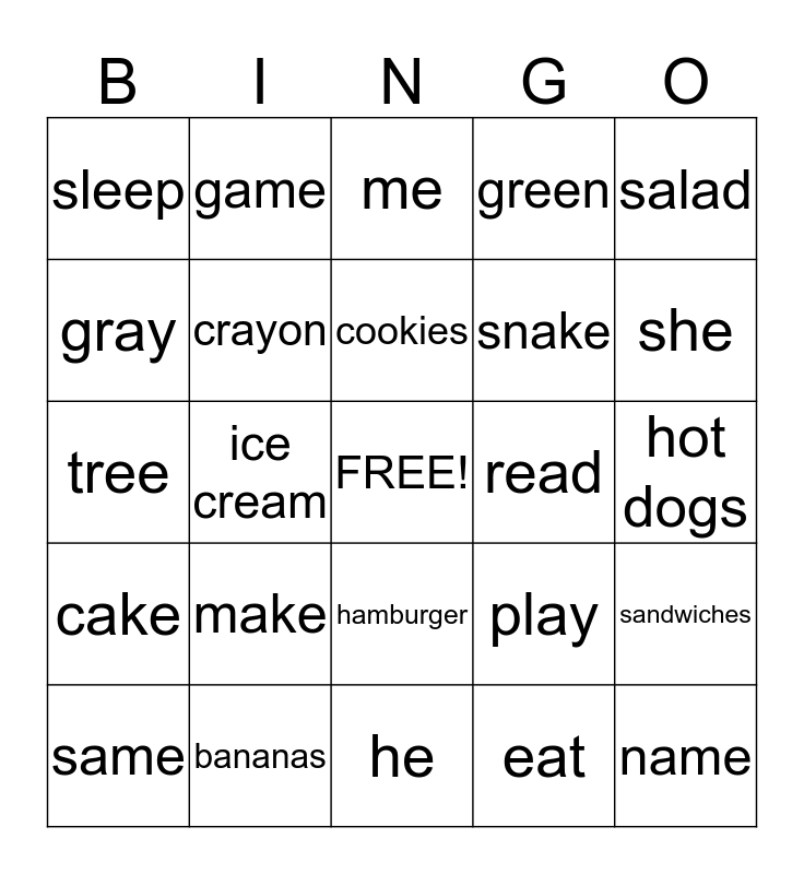 This bingo card has a free space and 24 words: make, bananas, cookies, same, salad, sleep, gray, game, read, hamburger, snake, tree, play, sandwiches, crayon, eat, hot dogs, me, she, ice cream, name, cake, green and he.