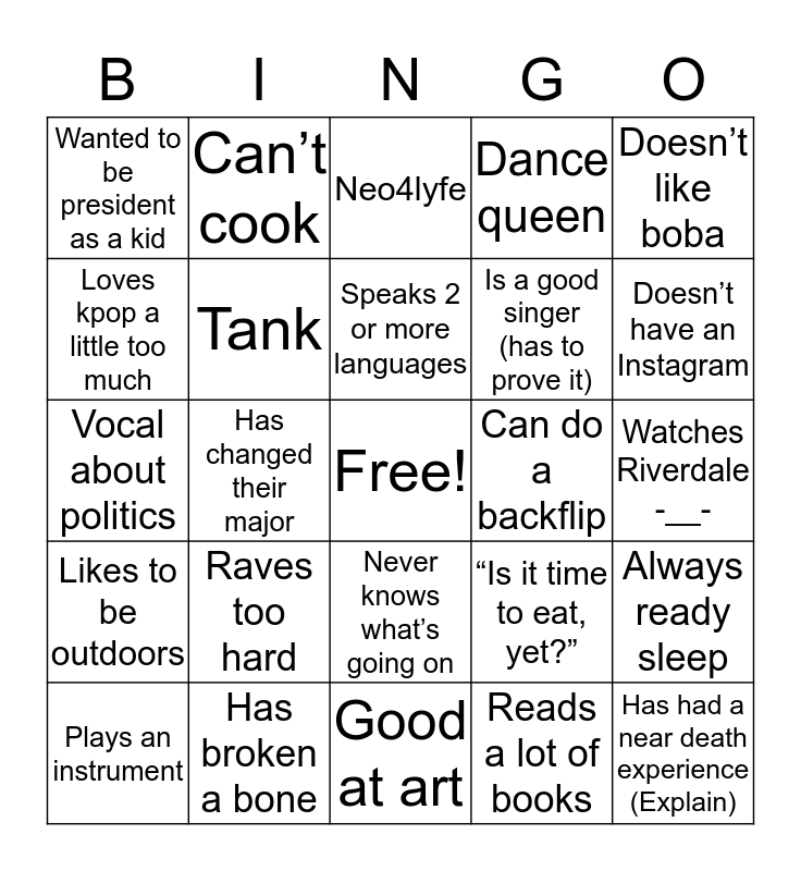 This bingo card has a free space and 24 words: Raves too hard, Has broken a bone, Speaks 2 or more languages, Plays an instrument, Doesn’t like boba, Wanted to be president as a kid, Loves kpop a little too much, Can’t cook, Can do a backflip, Never knows what’s going on, Is a good singer (has to prove it), Vocal about politics, “Is it time to eat, yet?”, Always ready sleep, Tank, Reads a lot of books, Watches Riverdale -__-, Neo4lyfe, Doesn’t have an Instagram, Has changed their major, Has had a near death experience (Explain), Likes to be outdoors, Dance queen and Good at art.