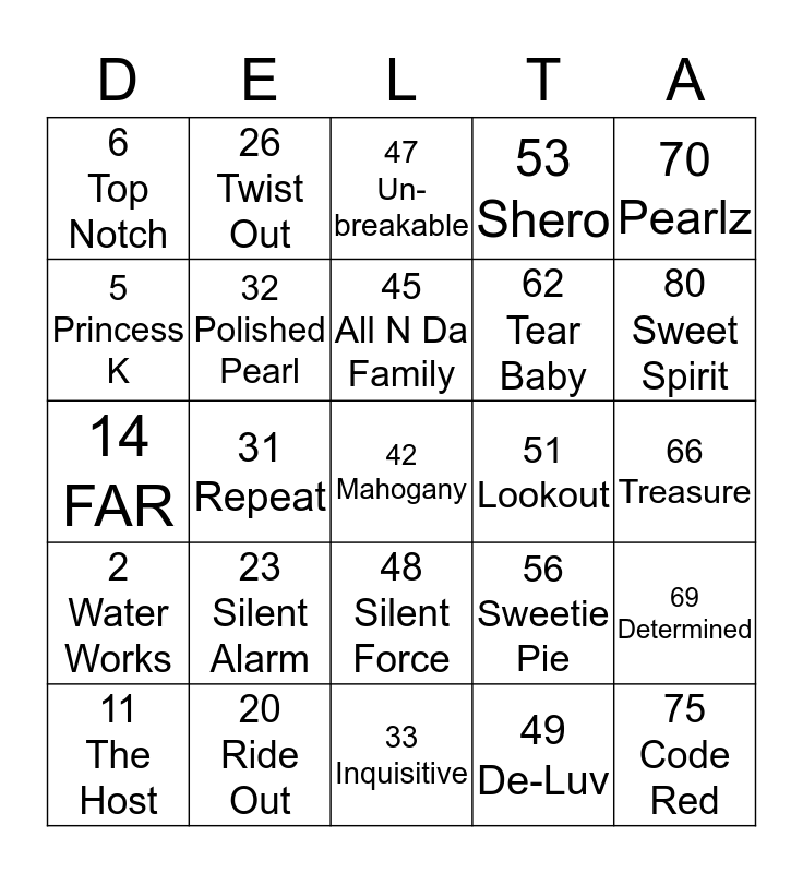 This bingo card has 80 words: 15 Grateful, 19 Ben Appetit, 47 Un-breakable, 60 Task Master, 72 Guiding Force, 12 Bravo, 27 Diamond, 46 Aligned, 49 De-Luv, 79 All In, 13 Rhythm Nation, 21 Guiding Light, 45 All N Da Family, 53 Shero, 78 Poised, 5 Princess K, 24 Southern Charm, 48 Silent Force, 57 Soulfully Suited, 66 Treasure, 7 Un-forgettable, 26 Twist Out, 42 Mahogany, 62 Tear Baby, 70 Pearlz, 8 Baby Doll, 18 Lyrical, 41 No Sweat, 64 Hopeful, 81 Last Call, 2 Water Works, 28 Money Moves, 44 Wade-N-Da-Water, 51 Lookout, 75 Code Red, 11 The Host, 30 Slice, 34 Saved By The Bell, 56 Sweetie Pie, 80 Sweet Spirit, 10 Sensitivity, 22 Amazing Grace, 35 Shhhh, 54 Quizlet, 71 Protector, 6 Top Notch, 20 Ride Out, 39 Family Ties, 59 Ribbon in the Sky, 65 Leggo, 3 Hidden Talent, 32 Polished Pearl, 33 Inquisitive, 63 Chameleon, 73 Private I, 16 Humming-bird, 25 Poetic Justice, 37 Story Time, 58 School Daze, 69 Determined, 14 FAR, 17 On Point, 40 Boss Lady, 61 Stay Woke, 76 Divine Order, 4 Picture Perfect, 29 Destined, 36 Sunshine, 55 Sistah Sistah, 67 Rhythmic Justice, 1 Miz Dot, 31 Repeat, 38 Seriously, 52 Gurl Code, 77 Headliner, 9 Show Stopper, 23 Silent Alarm, 43 La La, 50 ReServed and 74 Red Blossom.