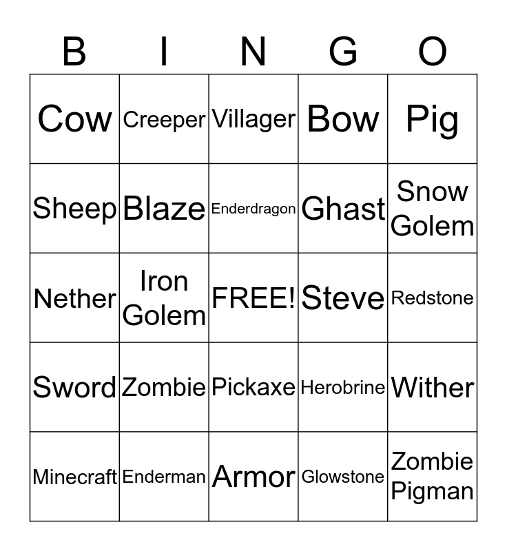 This bingo card has a free space and 24 words: Zombie, Enderman, Enderdragon, Minecraft, Pig, Cow, Sheep, Creeper, Steve, Pickaxe, Ghast, Nether, Herobrine, Wither, Blaze, Glowstone, Redstone, Villager, Snow Golem, Iron Golem, Zombie Pigman, Sword, Bow and Armor.