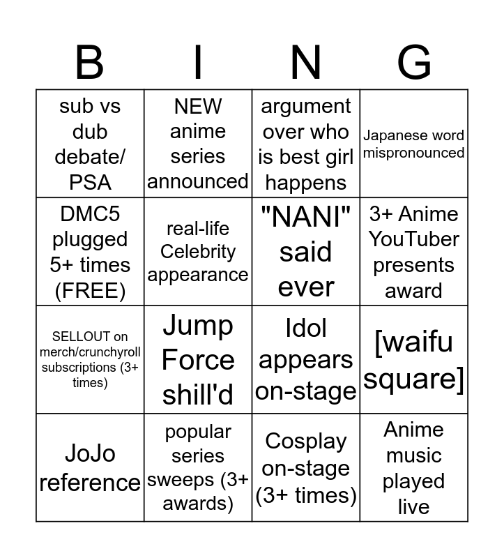 This bingo card has 16 words: popular series sweeps (3+ awards), [waifu square], argument over who is best girl happens, sub vs dub debate/ PSA, SELLOUT on merch/crunchyroll subscriptions (3+ times), NEW anime series announced, Idol appears on-stage, Cosplay on-stage (3+ times), DMC5 plugged 5+ times (FREE), real-life Celebrity appearance, JoJo reference, Japanese word mispronounced, Jump Force shill'd, 3+ Anime YouTuber presents award, "NANI" said ever and Anime music played live.