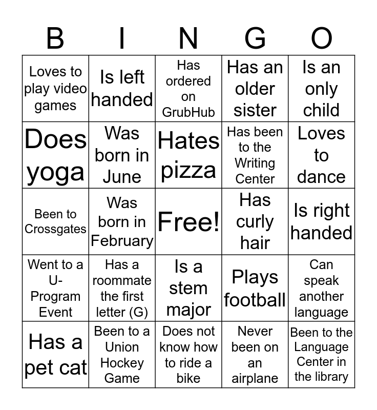 This bingo card has a free space and 48 words: Rides a motorcycle, Been to the Language Center in the library, Been to Florida, Does not know how to ride a bike, Has a roommate the first letter (G), Has a younger brother, Is left handed, Favorite Ice Cream flavor is Mint Chocolate Chip, Does yoga, Has taken a Political Science course, Was born in June, Has an older sister, Can speak another language, Plays football, Has been to 3 continents, Loves macaroni & cheese, Hates pizza, Has curly hair, Has a beard, Is an only child, Was born in February, Never been on an airplane, Loves to play video games, Has been to the Writing Center, Has a pet dog, Loves to dance, Has a pet cat, Has ridden a horse, Is a stem major, Went to a U-Program Event, Knows the 7 traditions of Union, Has made a YouTube video, Plays a musical instrument, Has written a blog, Been to a Union Hockey Game, Seen a movie at Reamer Auditorium, Is born in a different country, Is right handed, Has been to Becker Career Center, Has walked a dog from Wicker Wellness Center, Has eaten at Peter Pause Restaurant, Been to the Greenmarket, Has ordered on GrubHub, Purchased a $5 ticket to Bowtie Cinema from Student Activities, Been to Crossgates, Has a twin, Knows how to play Chess and Favorite color is purple.