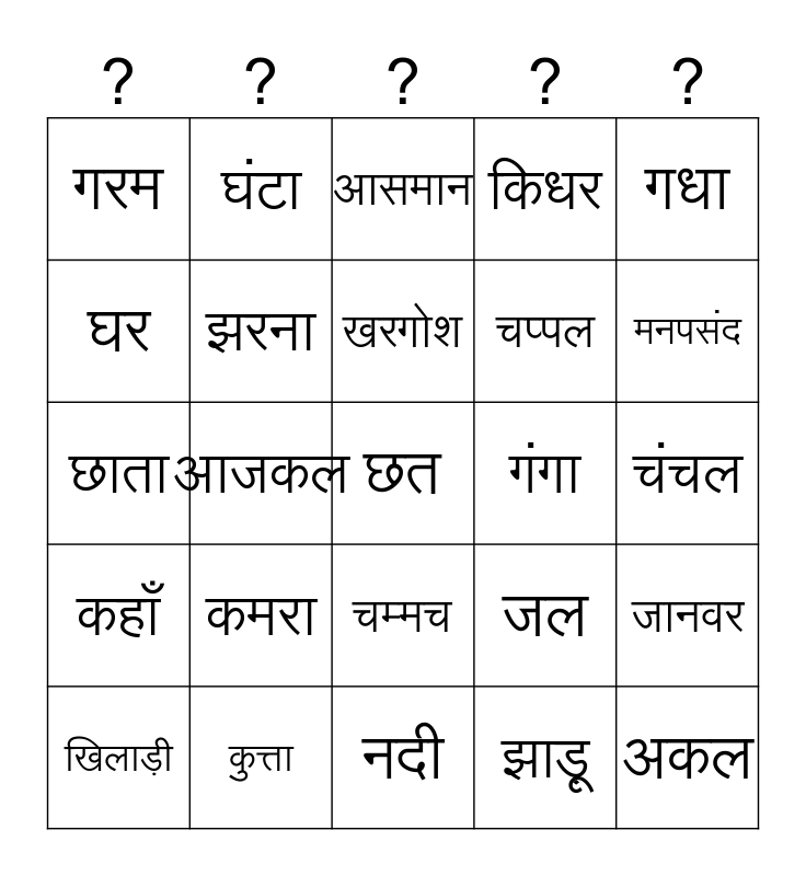 This bingo card has a free space and 24 words: कमरा, कुत्ता, खरगोश, खिलाड़ी, गधा, गरम, घर, घंटा, गंगा, चम्मच, चप्पल, छाता, जल, जानवर, झरना, झाड़ू, चंचल, आसमान, मनपसंद, आजकल, अकल, कहाँ, किधर and नदी.