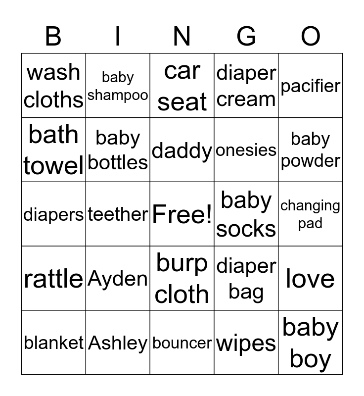 This bingo card has a free space and 29 words: bibs, Ashley, car seat, family, pacifier, wash cloths, baby bottles, daddy, baby socks, love, blanket, teether, wipes, baby boy, diapers, stroller, bouncer, diaper bag, baby powder, rattle, Ayden, high chair, onesies, changing pad, bath towel, baby shampoo, burp cloth, diaper cream and baby monitor.