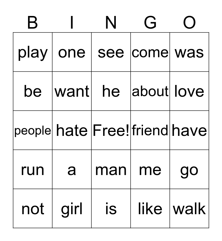 This bingo card has a free space and 24 words: a, girl, he, not, was, play, be, one, friend, man, about, people, me, go, want, like, have, see, love, hate, walk, run, come and is.