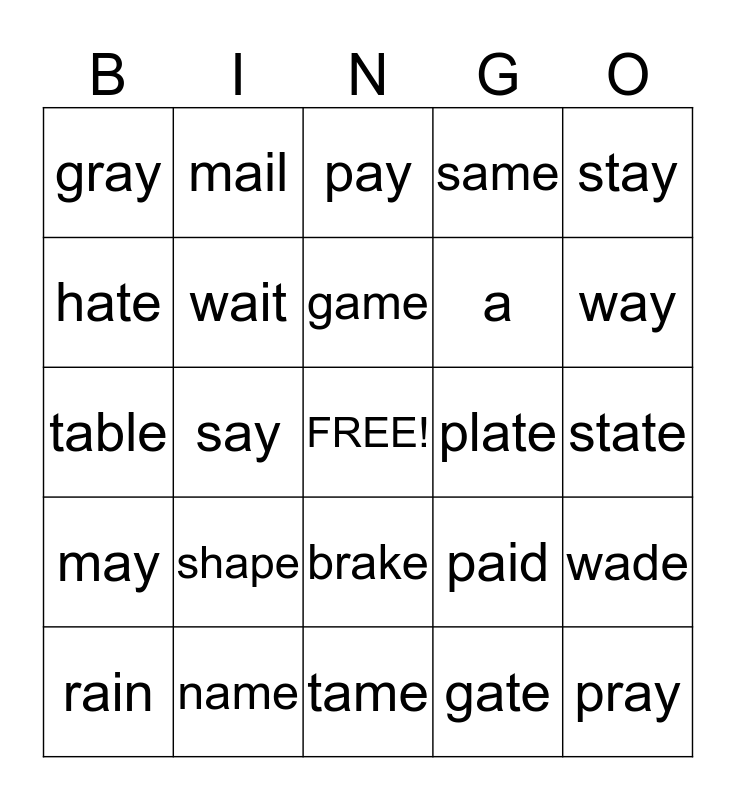 This bingo card has a free space and 24 words: shape, name, game, rain, stay, gray, hate, mail, plate, brake, a, table, paid, wade, wait, gate, state, pay, way, say, pray, may, same and tame.