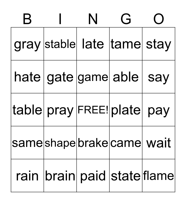 This bingo card has a free space and 24 words: shape, brain, game, rain, stay, gray, hate, stable, plate, brake, able, table, came, wait, gate, state, pay, late, say, pray, flame, same, tame and paid.