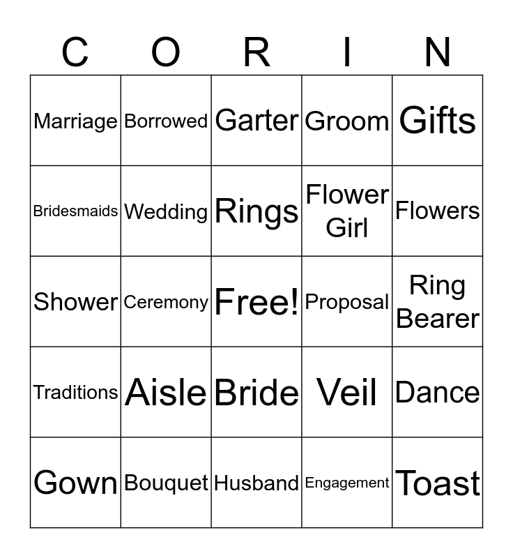 This bingo card has a free space and 35 words: Candles, Memories, Invitations, Wedding, Bride, Groom, Bridesmaids, Groomsmen, Rings, Honeymoon, Shower, Gifts, Love, Forever, Marriage, Proposal, Engagement, Ceremony, Traditions, Toast, Veil, Gown, Dance, Bouquet, Garter, Flowers, Cake, Vows, Flower Girl, Ring Bearer, Wife, Husband, Aisle, Borrowed and Kiss.