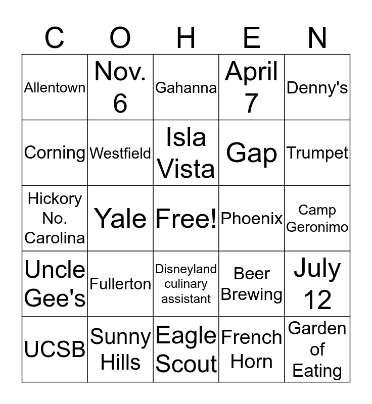 This bingo card has a free space and 29 words: UCSB, CAL, Yale, Justin, Allentown, Gahanna, Westfield, Fullerton, Phoenix, Sunny Hills, Camp Geronimo, Garden of Eating, Eagle Scout, French Horn, Trumpet, Sabado Tarde, Disneyland culinary assistant, Uncle Gee's, Denny's, Hickory No. Carolina, Beer Brewing, The Body Shop, Gap, Corning, April 7, Nov. 6, July 12, Isla Vista and Community Service.
